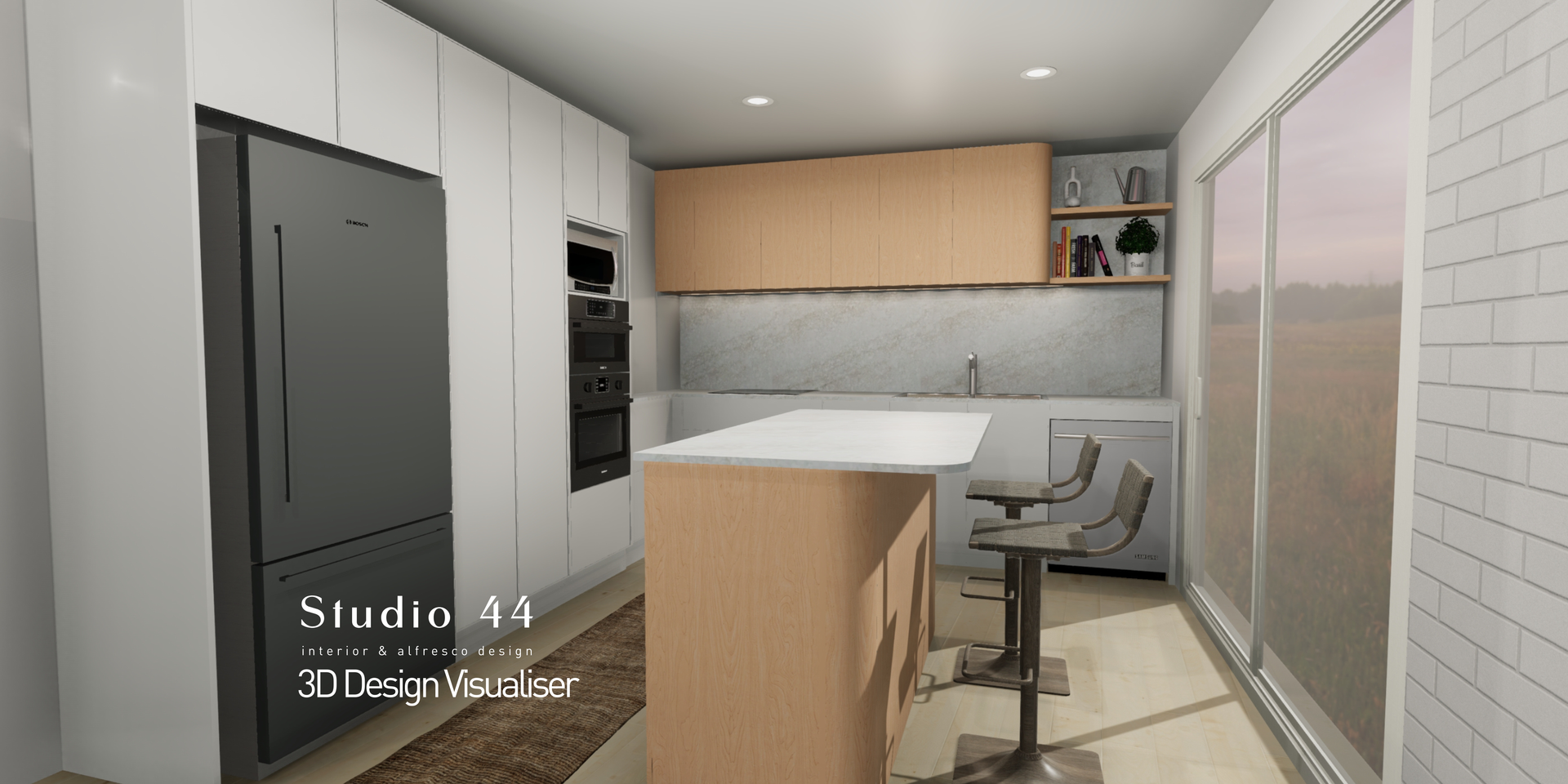In this project, the 3D visualiser allowed the clients to clearly conceptualise the curved cabinetry, curved bench-tops, and the contrast between the warm timber and crisp white finishes before a single piece was built.